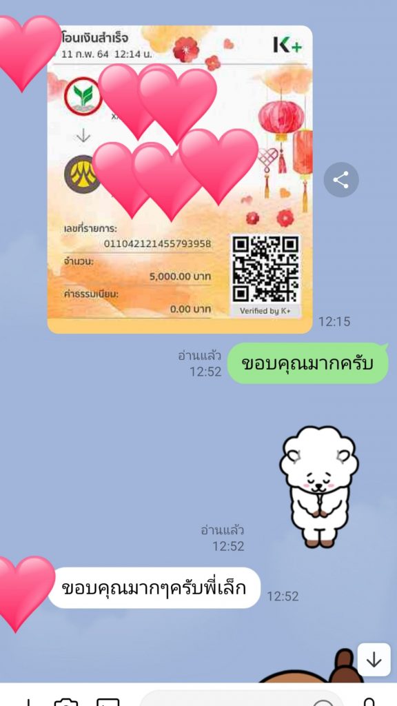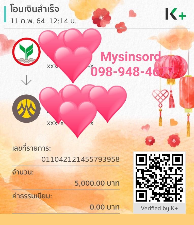 ขอบคุณคุณลูกค้าที่มอบความไว้วางใจ ชำระเงินค่ามัดจำการเช่าสินสอด จำนวน 5,000 บาท ความลับของลูกค้าสำคัญที่สุด ไม่ว่าจะใกล้หรือไกล เรา mysinsord บริการด้วยใจ เราจะบริการให้ดีที่สุด จัดส่งสินสอดทั่วประเทศ