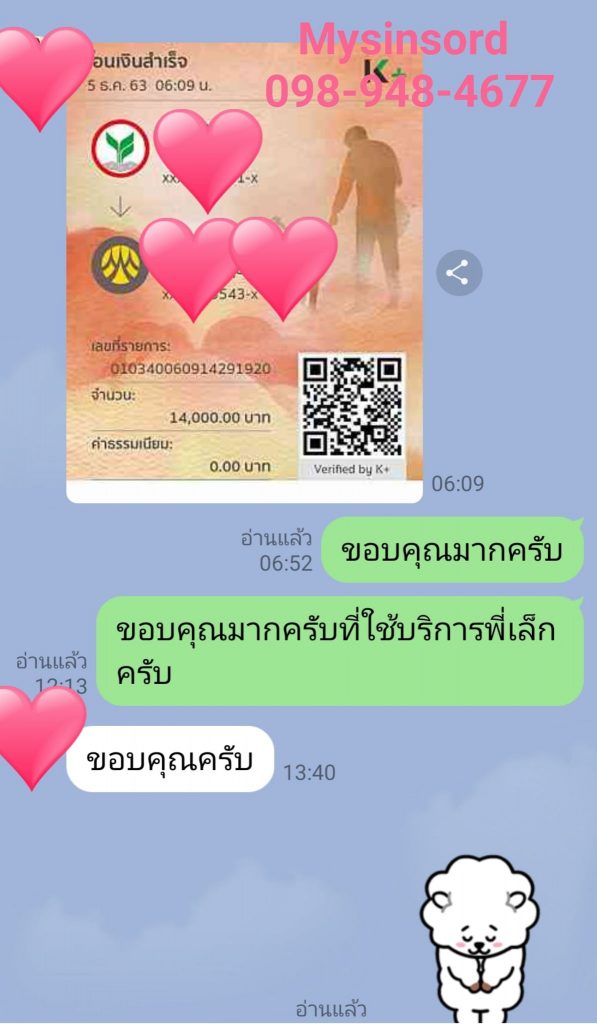 ขอบคุณลูกค้าที่มอบความไว้วางใจ​ ใช้บริการ​ mysinsord​ ชำระเงินค่าเช่าสินสอด จำนวน 14,000 บาท ความลับของลูกค้าสำคัญที่สุด​ ไม่ว่าจะใกล้​หรือไกล​ เรา​ mysinsord บริการด้วยใจ​ เราจะบริการให้ดีที่สุด จัดส่งสินสอดทั่วประเทศ​